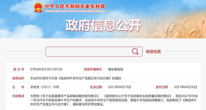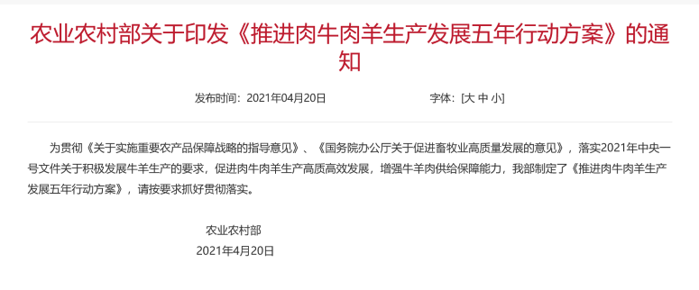 農(nóng)業(yè)農(nóng)村部關(guān)于印發(fā)《推進(jìn)肉牛肉羊生產(chǎn)發(fā)展五年行動(dòng)方案》的通知