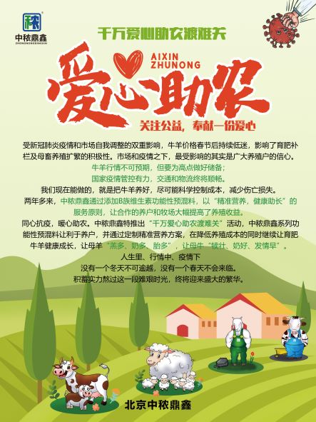 同心抗疫,暖心助農(nóng)。中秾鼎鑫特推出“千萬愛心助農(nóng)渡難關”活動,中秾鼎鑫系列功能性預混料讓利于養(yǎng)戶,并通過定制精準營養(yǎng)方案,在降低養(yǎng)殖成本的同時繼續(xù)讓育肥牛羊健康成長,讓母羊“羔多、奶多、胎多”,讓母牛“犢壯、奶好、發(fā)情早”。