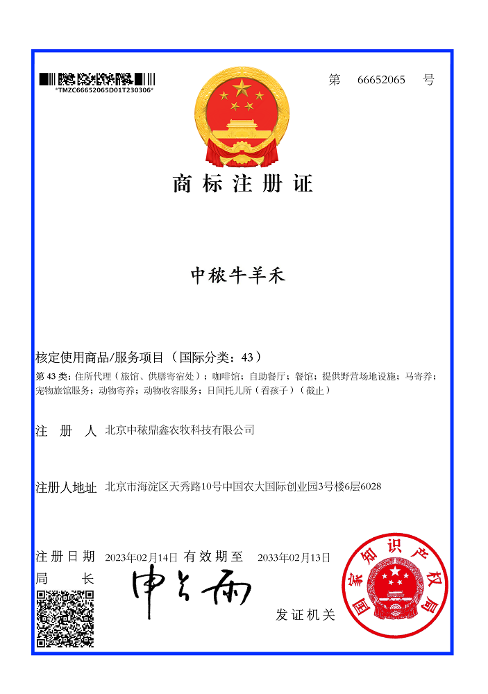 中秾牛羊禾43類(lèi)商標(biāo)注冊(cè)證書(shū)