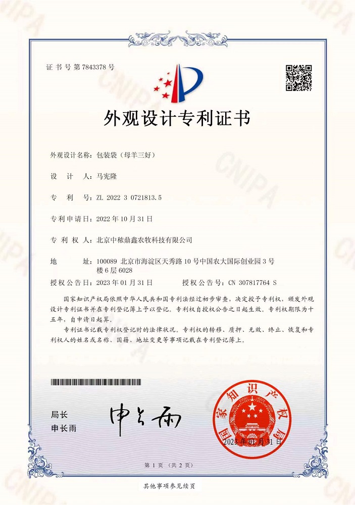 母羊三好外觀設計專利證書